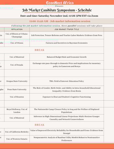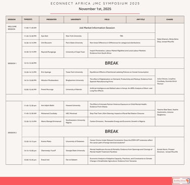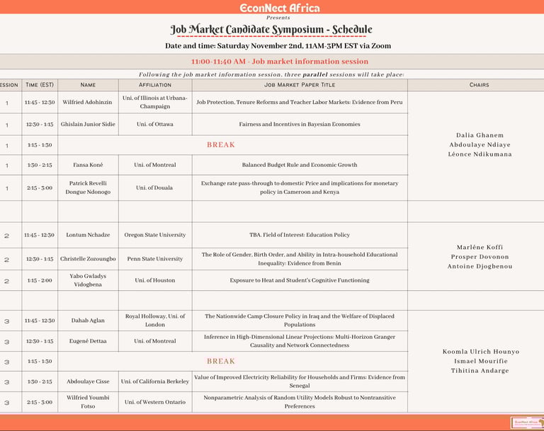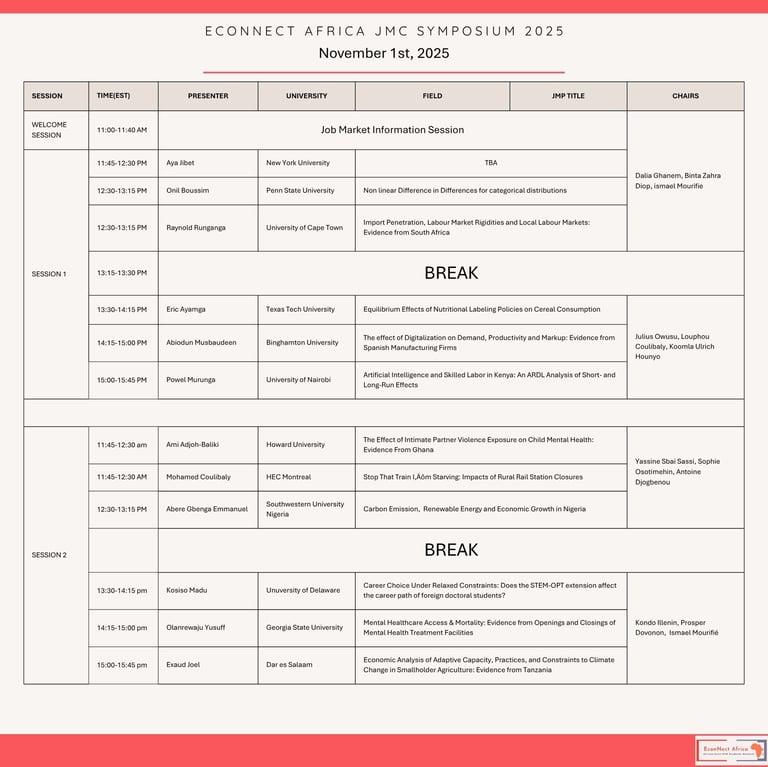 Building on last three year's success with EconNect Africa JMCs Symposium, we are issuing a call for this year JMCs to participate in this year's program. Being part of this program will give you access to events that aim at supporting you in navigating the job market. Find below a snapshot of previous years' job market program. Application will open in June (Deadline September 15th)